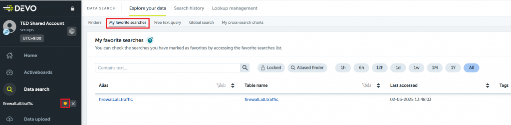 過去に検索したクエリに対して「♡」マークをクリックするだけで、お気に入り検索として保存可能です。頻繁に使用するクエリはここに登録しておくことで、ワンクリックで簡単に呼び出せるので作業効率がアップします。