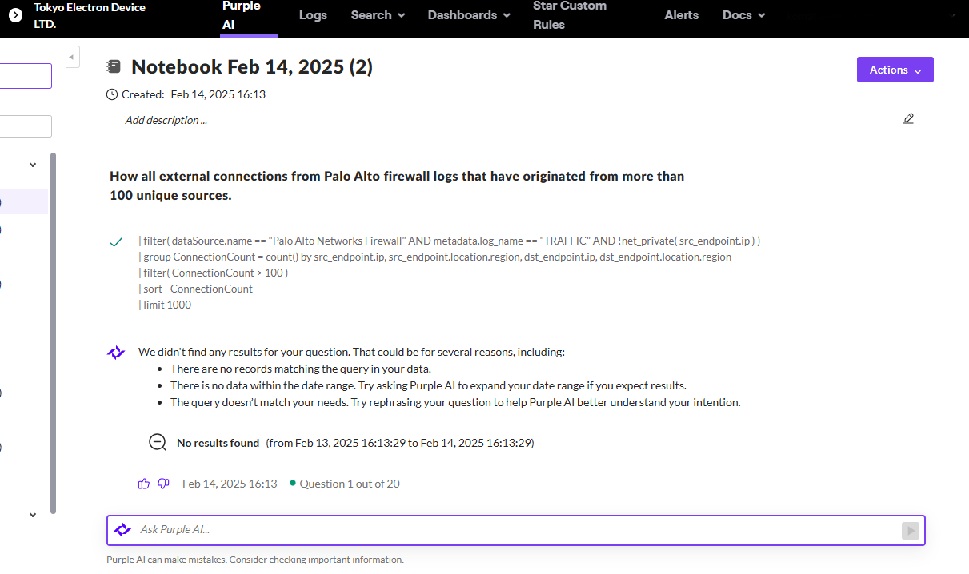 また、Purple AIを利用することでPalo Alto Networks Firewall ログソースに対する脅威ハンティングや調査クエリを作成することが可能です。