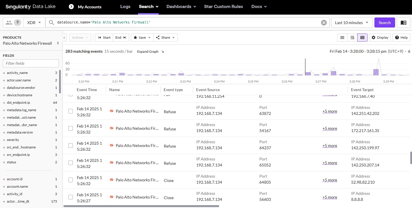上記の設定を行うと、SentinelOne Data Lake画面にてPalo Alto Networks Firewall のログが確認できます。