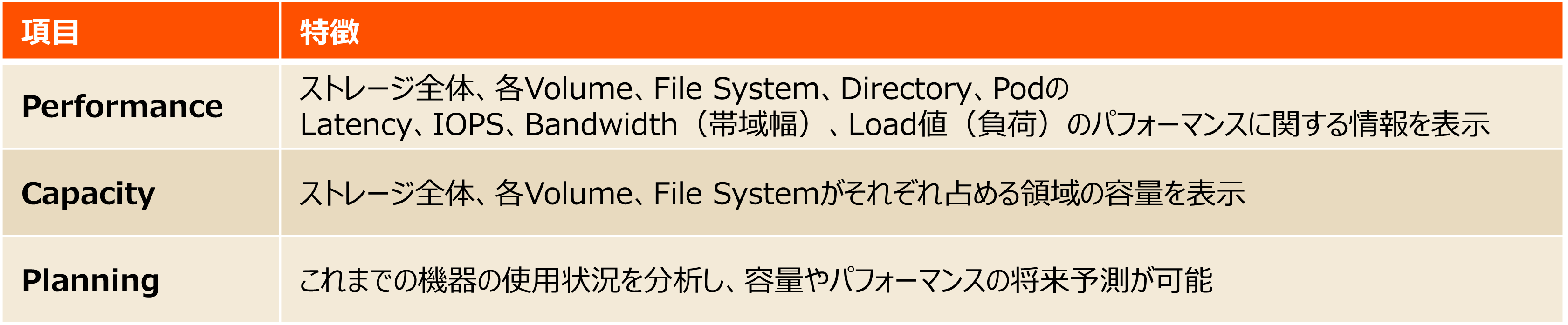 Pure1のANALYTICSは、ログイン後のPure1画面の左側中部に存在するタブです。ご利用のEverpure(旧:Pure Storage)社製品のパフォーマンスや容量などを把握できる機能となり、下記3つの項目で構成されています。各項目の機能を表にしました。