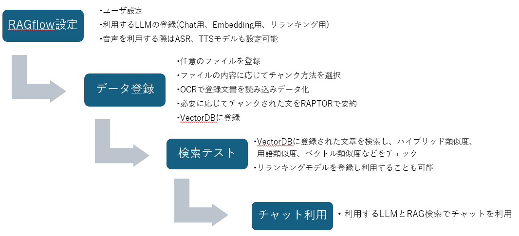 RAGflowをチャットで利用するまでの流れは以下となります。