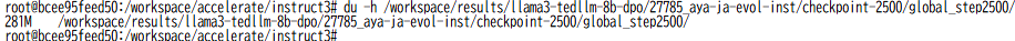 LoRAで追加したcheckpointのファイルサイズは280MB程度。full parameterで訓練した場合、ベースとなるモデルのcheckpoint (llama3-tedllm-8b)の31GBと同程度のサイズとなる。
