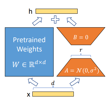 今回は訓練手法としてLoRA(Low-Rank Adoptation)を用います。LoRAはfine-tuningの一種であり、訓練時のフォワードプロパゲーションでは元のモデルが持つ重みと低次元の重みA,とBからなる低次元層の計算結果を足し合わせて出力を算出し、バックプロパゲーションではAとBの重みのみを更新するという手法です。