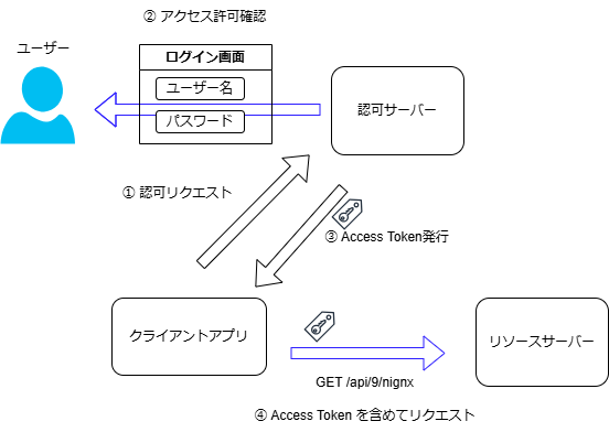 この図のように、クライアントアプリは認可サーバーに対して、アクセストークンの発行を依頼すると、認可サーバーがユーザーに確認を行い問題なければ、アクセストークンが発行されます。