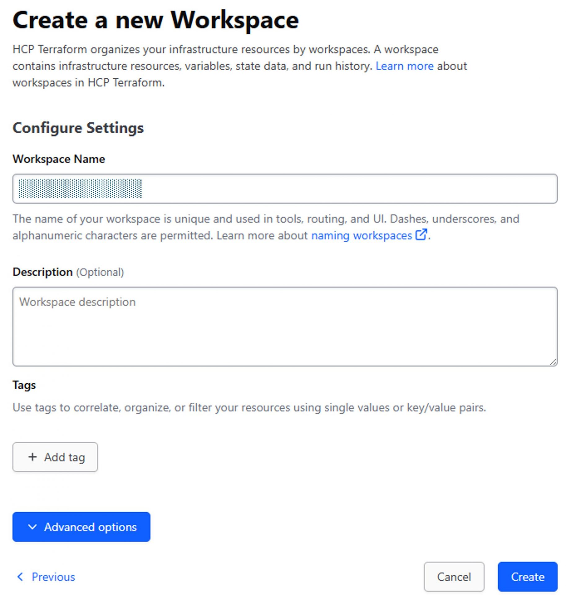 - Workspace名/説明/タグの登録を行う(Advanced Option について今回は省略)