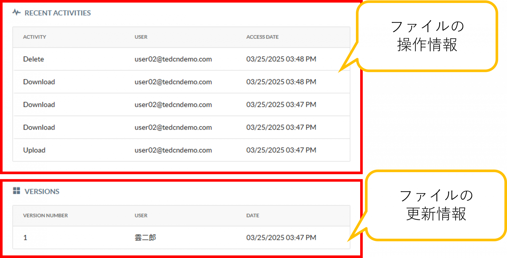 ファイルが現在誰と共有されているか(社内ユーザーのみか、社外ユーザーとも共有されているか)、またそのファイルに対して最近行われた操作履歴(閲覧、編集、ダウンロード、削除など)を確認できます。直近のアクティビティを把握することで、不審な動きや不適切な利用がないかをチェックし、問題発生時には迅速に対応できます。