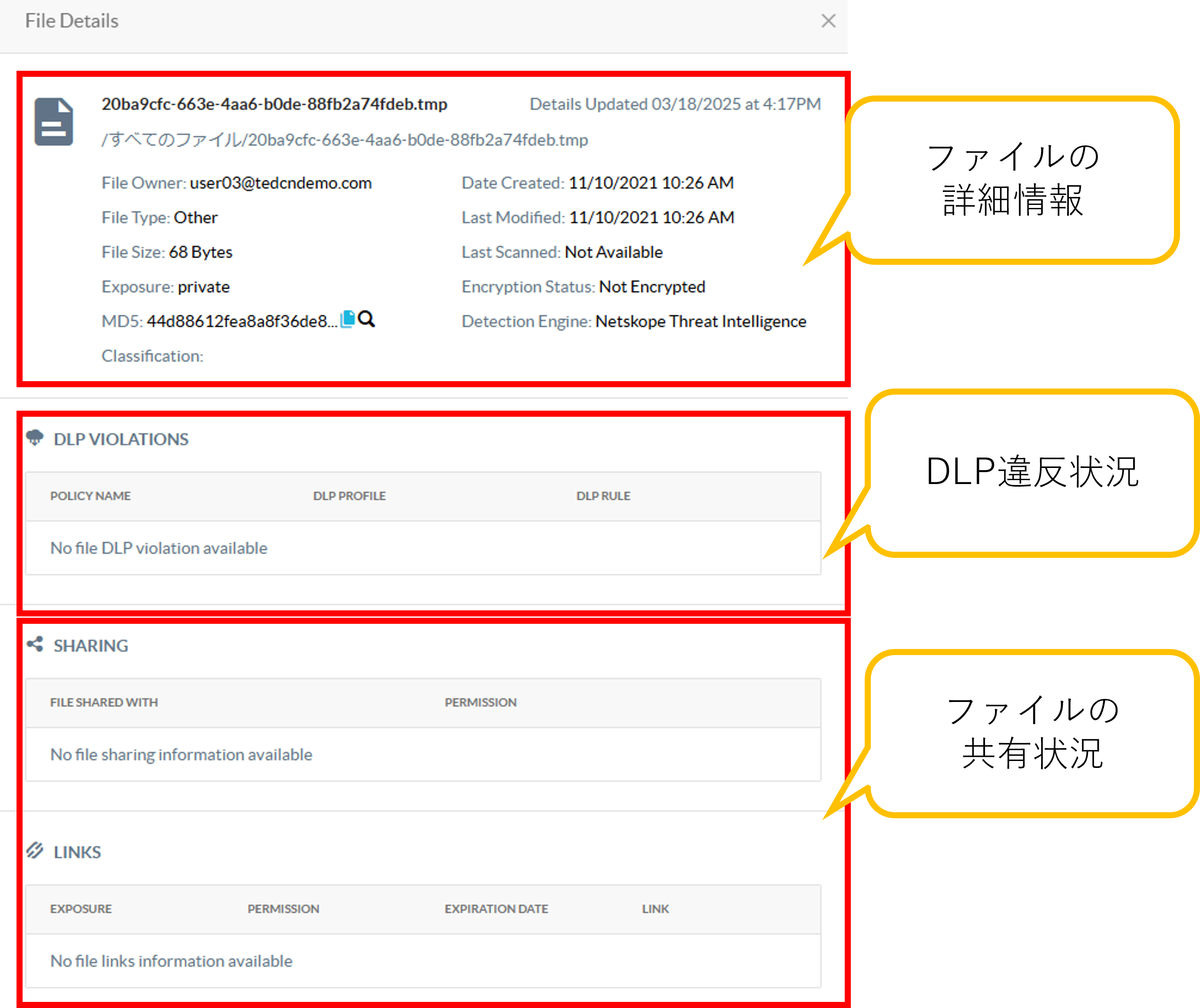 Netskopeは主要なSaaSアプリケーション(例:BoxやGoogle Workspace、Microsoft 365など)とAPI連携し、各サービス内に保存されているファイルユーザーなどの情報を一覧で確認できます。