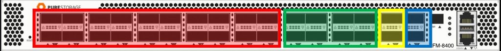 XFMのポート構成は下記のとおりです。赤色の枠で囲った左から20ポートが、それぞれのFBのシャーシにつながるポート、緑色の枠で囲った8ポートがお客様環境に接続されるポート、黄色の枠で囲った2ポートは未使用のポートとなり、青色の枠で囲った2ポートはそれぞれのXFM同士でつなげるインターコネクション用のポートになります。その右には、Managementポートと、シリアルコンソール用のポートがあります。