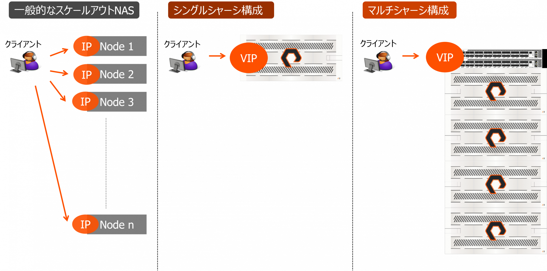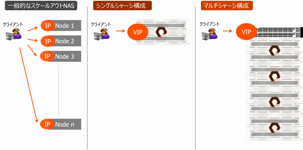 FBへのアクセスは、シングルシャーシの場合も、XFMを利用したマルチシャーシ構成の場合も最小1つのVIP(Virtual IP address)でのシステム管理ができます。シャーシ単位の管理は不要であり、XFMのVIPにアクセスすることで一元的に管理することが可能です。一般的なスケールアウトNAS(Network Attached Storage)では、ノードごとにIPアドレスを持つことで、煩雑なIPアドレスの管理や大量のDNSエントリが必要となるケースがあります。しかしながら、FBの場合は、お客様での煩雑なIPの管理や、大量のIPアドレスの払い出しの必要性がなく、シンプルにご利用いただけます。