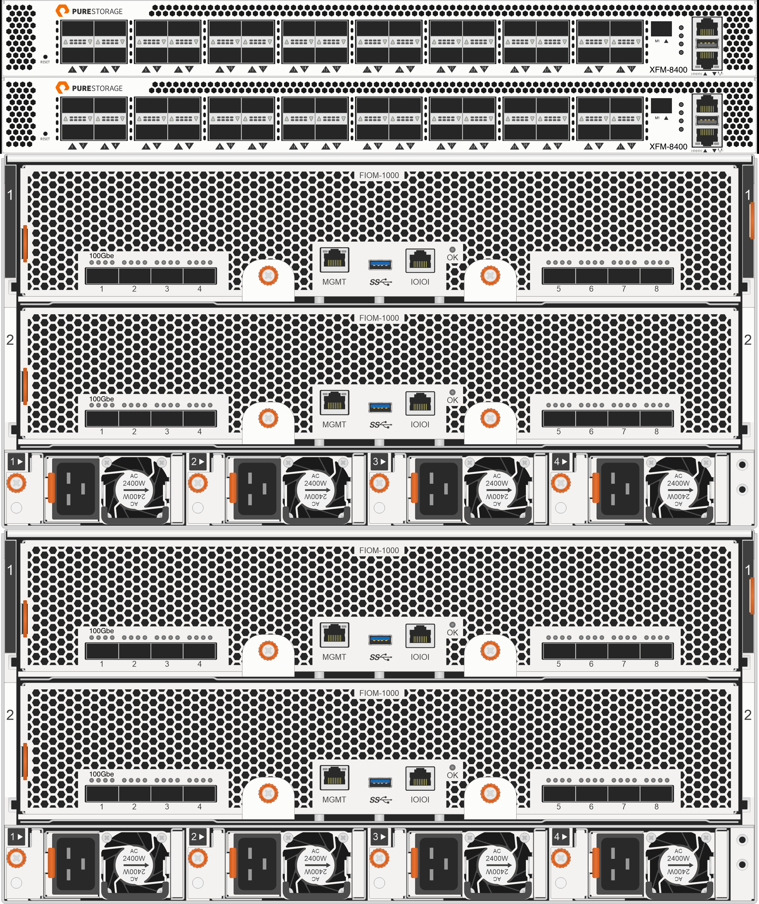 筐体側は、最小構成が2筐体(マルチシャーシ構成)で、前面には、Bladeが搭載され、その中に、DFM(Direct Flash Module)が搭載されています。なお、1Bladeあたり、4個のDFMが搭載されていますが、このDFMの数は4個で固定となります。背面は、下部にPSMが4個と、その上にFIOM(Fabric IO Module)が2個搭載されています。電源は200V(IEC320-C14 ⇔ IEC320-C13:ラックの電源はC14を使用する形)で稼働します。