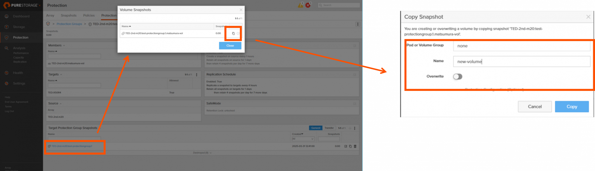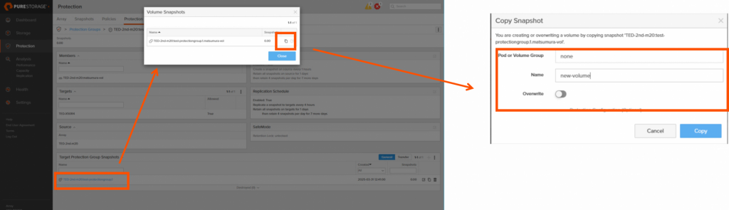 GUI:Protection > Protection Groups > Target Protection Groups > 転送されてきたProtection Group > Target Protection Group Snapshotの中にある転送されてきたSnapshotをクリック > 表示されるポップアップから、Copy Snapshotボタンをクリック > Nameに任意のVolume名を入力し、Copy