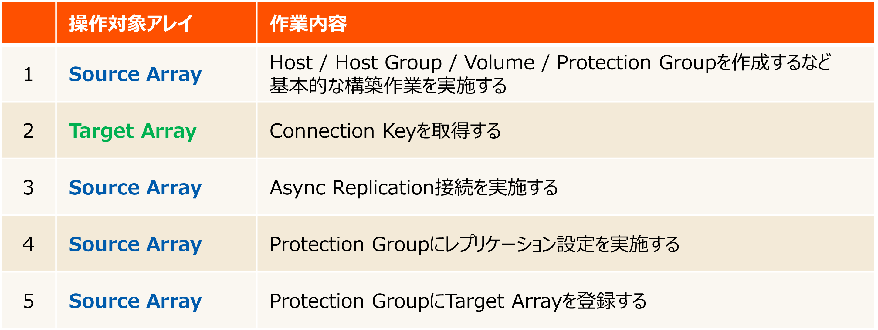 今回、Purityバージョンについては、Source Arrayをv6.3.17、Target Arrayをv6.5.9の機器にて実施しますので、一部Purityバージョンでは表記が異なる場合があります。まずは、手順を表にまとめました。手順は大きく5つです。