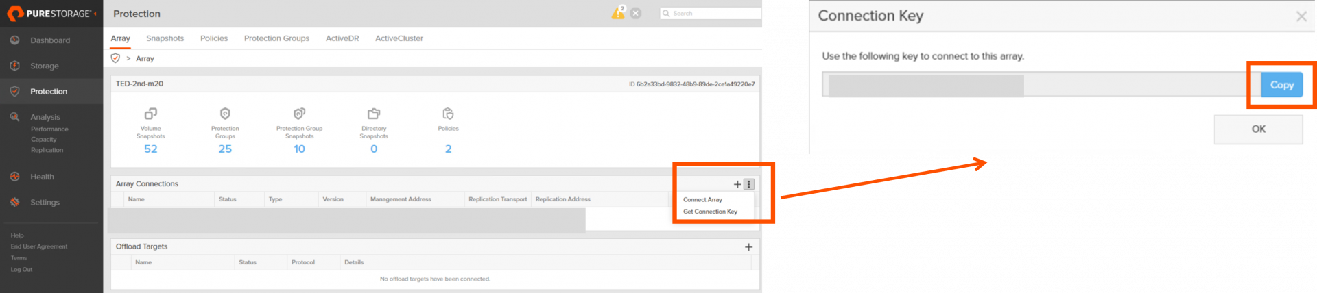GUI:Protection > Array > Array Connectionsの縦三点リーダ > Get Connection Keyを選択。表示されるKeyをCopy