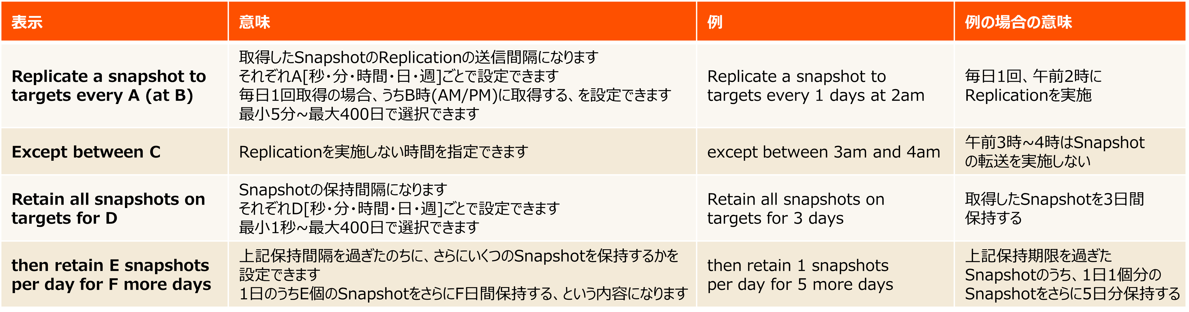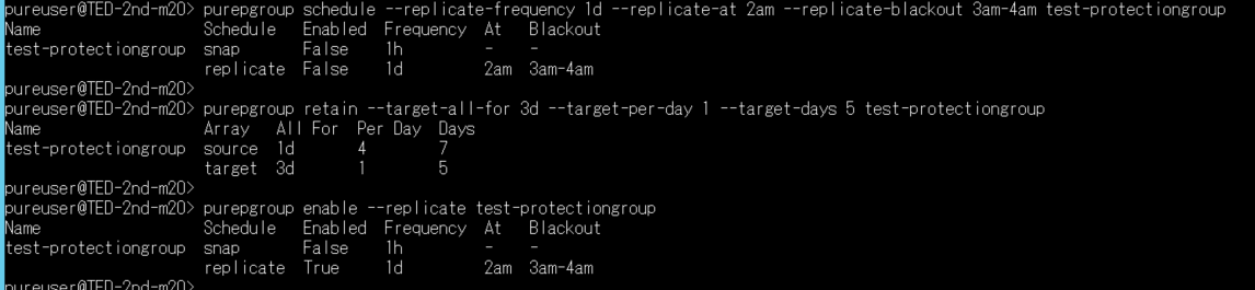 CLI:purepgroup schedule --replicate-frequency [A] {--replicate-at [B] --replicate-blackout [C]} [Protection Group名]