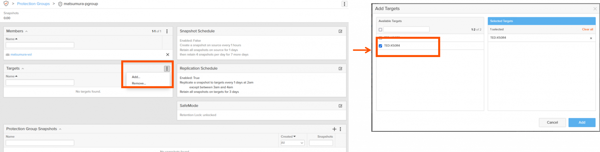 GUI:Protection > Protection Groups > Source Protection Group > 作成したProtection Group > Targetsの縦三点リーダ > Add…を選択。Target Arrayを選択し、Add