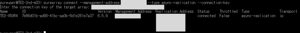 CLI:purearray connect --management-address [Target Arrayの仮想管理IPアドレス] --type async-replication --connection-keyコマンドを入力