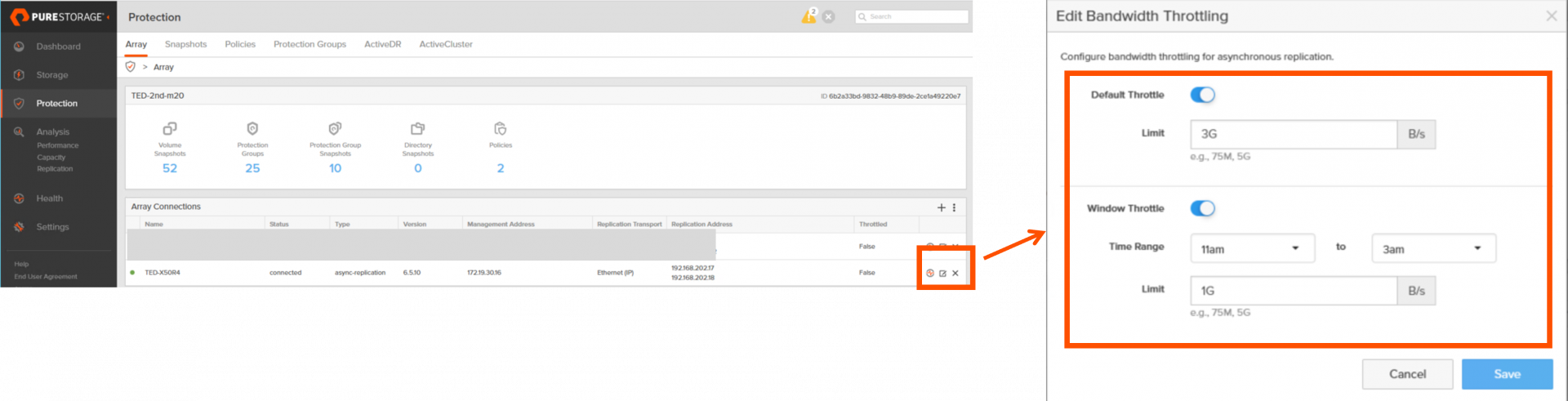 GUI:Protection > Array > Array Connections > 設定したいArrayのEdit Bandwidth Throttleボタンを選択。任意の設定を入力し、Save