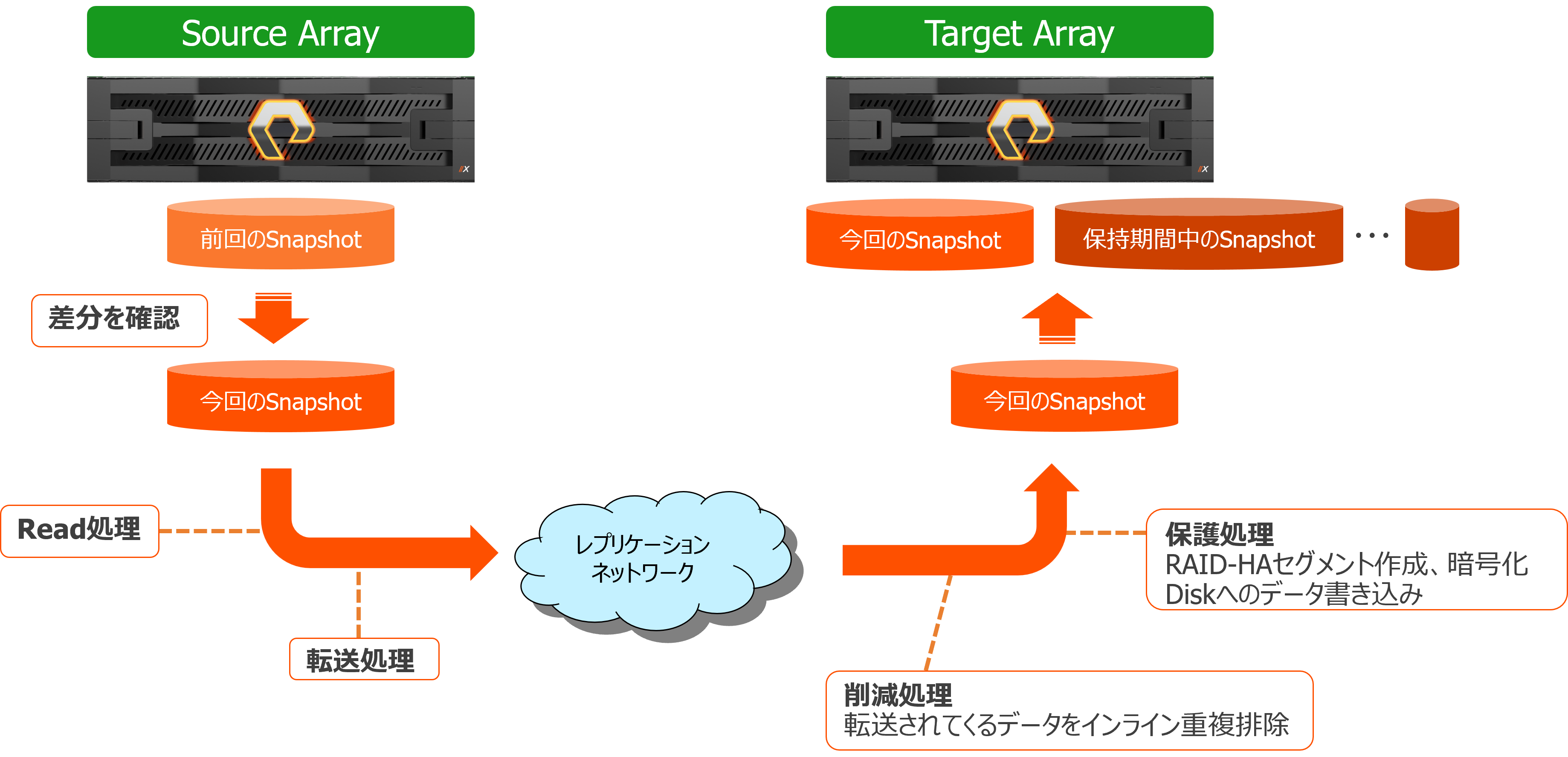・ Source Arrayには、最新のSnapshotのみが保存され、Target Arrayにはスケジュールで指定した世代数のSnapshotが保持されます。