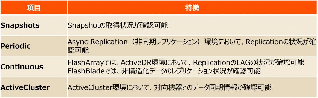 Pure1のPROTECTIONは、ログイン後のPure1画面の左側中部に存在するタブです。Pure Storageのデータ保護に関する管理機能を提供するツールとなり、下記4つの項目で構成されています。各項目の機能を表にしました。