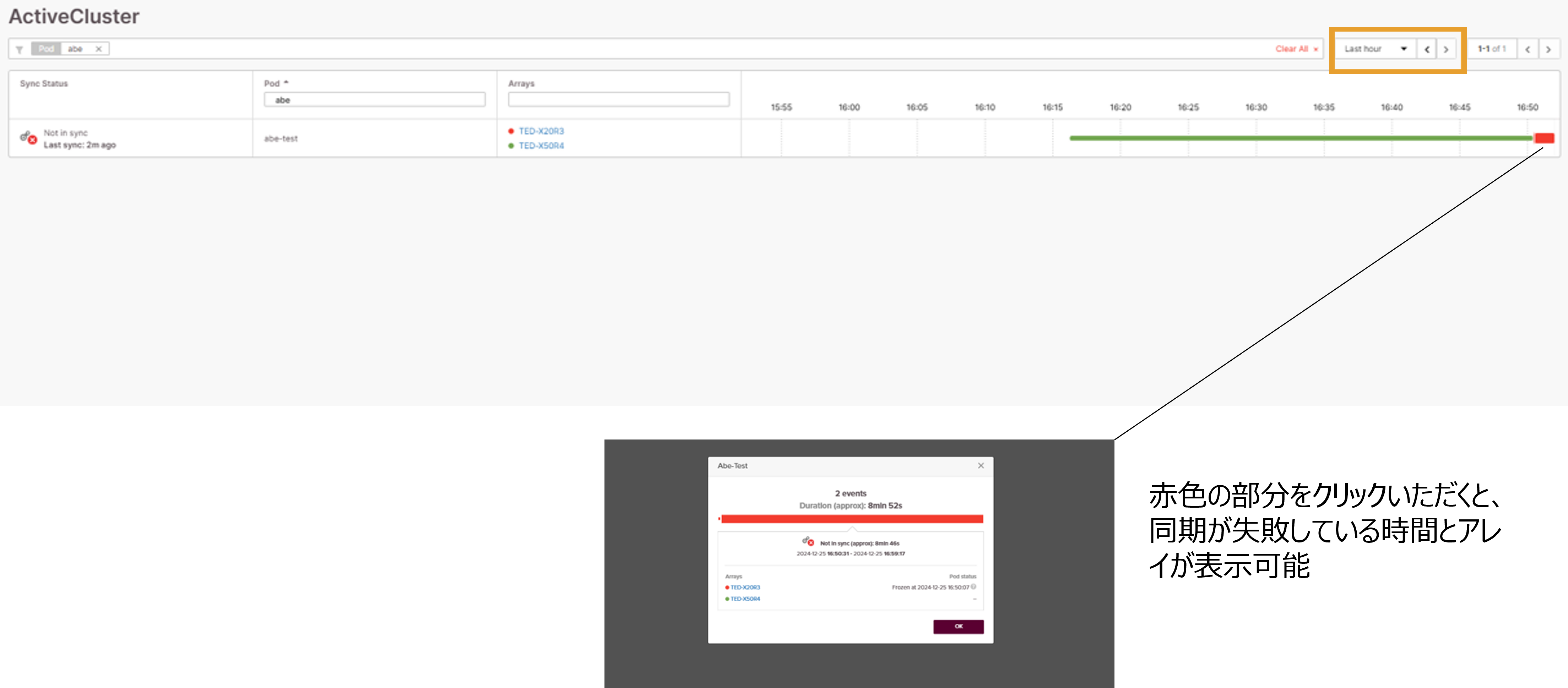 PROTECTIONのうち、ActiveClusterの画面についてご紹介します。ここでは、ActiveClusterを構成しているとき、筐体間でのデータの同期状況を確認することが可能です。同期のチャートでは、正常稼働時は緑色で表示されますが、再同期している状況や、同期されていない状況では、黄色と赤色で表示されます。チャート上の赤色で表示されている個所をクリックすると、同期が中断された時間や中断期間など、詳細な情報が表示されます。こちらのチャートも最大30日前まで表示することが可能です。
