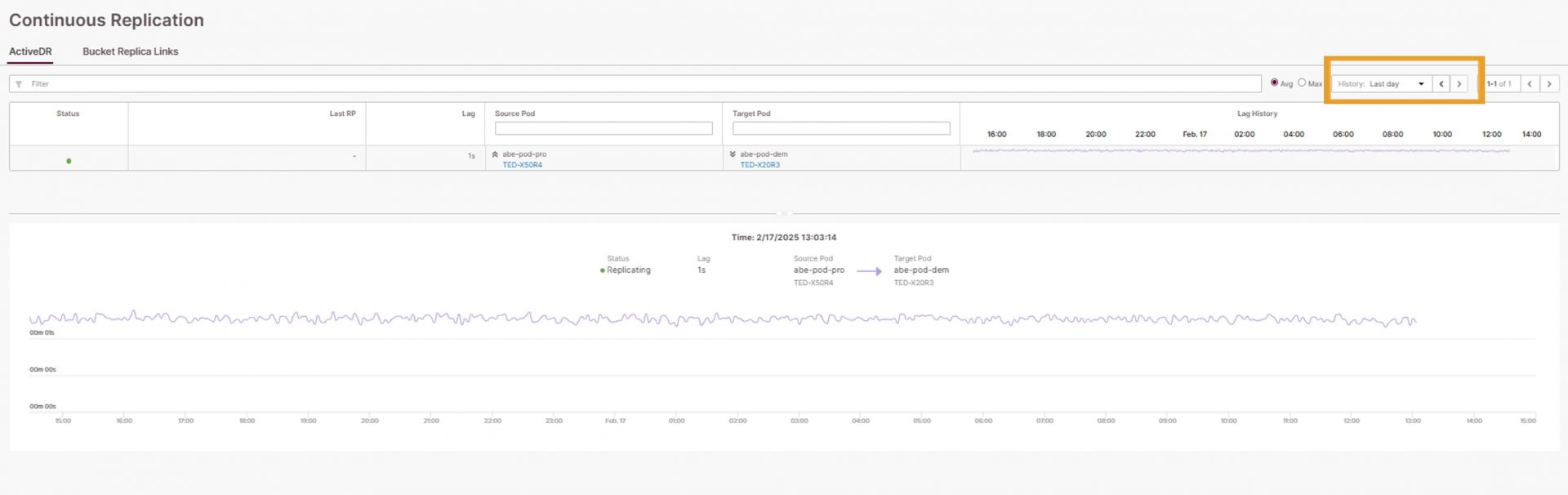 PROTECTIONのうち、Continuous画面についてご紹介します。ここでは、ActiveDRを構成しているとき、ソースアレイからターゲットアレイへのデータの転送状況を確認することが可能です。Lag Historyのチャートにカーソルを合わせると、ソースアレイ側からターゲットアレイ側へのデータ転送のタイムラグ(Lag)を表示することができます。こちらのチャートも最大30日前まで表示することが可能です。