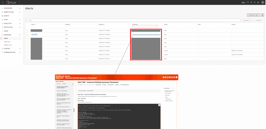 MESSAGESのうち、Alertsの画面ついてご紹介します。Pure Storageで障害等が発生した時、機器からAlertが発報されます。AlertのSeverityは、重要度の高いものから、Critical、Warning、Informationで定義されます。また、Alertのステータスは、Open、Closing、Closedで定義されます。Openは事象が発生し解決していない状況で、これが解決するとClosingに移行し、一定期間経過後に、自動的にClosedへ移行します。画像は当社検証環境にて発生しているAlertの一覧です。赤枠で囲ったSummaryのリンクをクリックいただくと、Pure Storageが提供するナレッジベースサイトに移動しAlertの詳細を確認することができます。