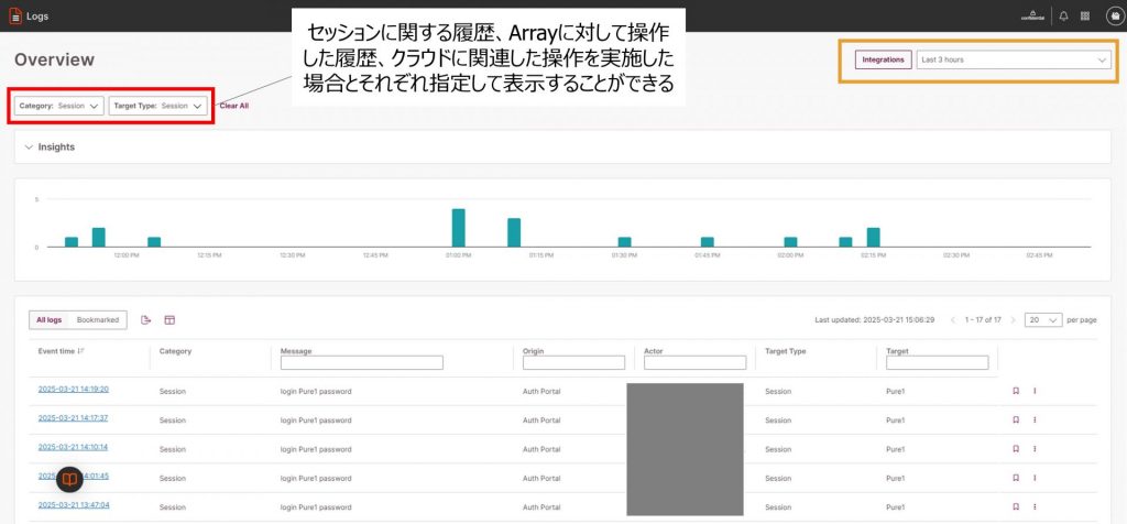 Audit LogかSession Logのいずれかをクリックすると、別タブが開きます。開かれるページはAudit Log/Session Logどちらをクリックしても同一のページです。Pure Storageの各種操作(GUI、CLI、REST API)の履歴と、Pure Storage機器やPure1へのログインまたはログアウト操作の履歴が記録されます。オレンジ枠で囲ったIntergrationsからCustomを選択することによってどちらも最長1年前のログまで遡ることができます。下の画像では、Category:Session、Target Type:Sessionで設定して、ログイン、ログアウト操作の履歴のみを表示させたものになります。画像では、実際に当社メンバーがPure1へログインした履歴が確認できます。