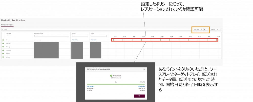 PROTECTIONのうち、Periodicの画面についてご紹介します。ここでは、Async Replication(非同期レプリケーション)接続されているProtection Groupについて、設定されているレプリケーションのスケジュールによって転送されたデータの転送状況を確認することが可能です。