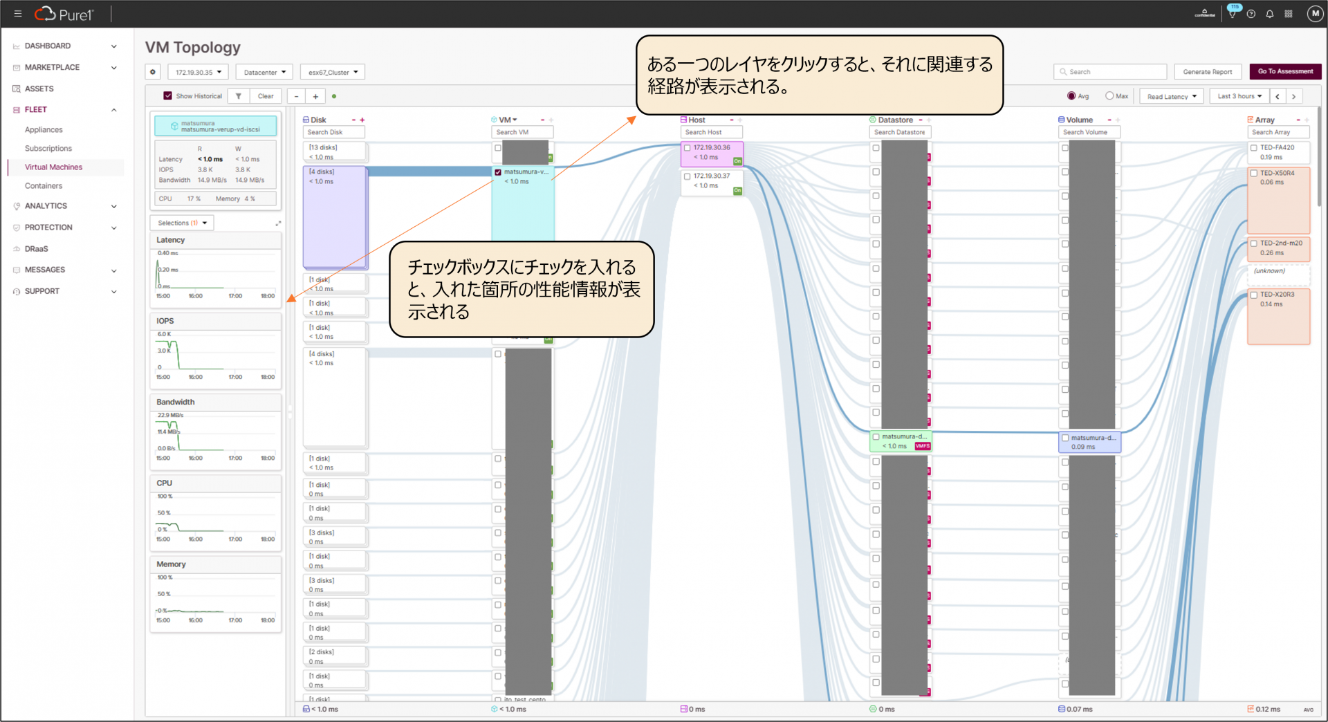 Pure1のVirtual Machinesは、ログイン後のPure1画面の左側中部に存在するFLEETから確認できます。Virtual Machinesは、VMwareからFlashArrayまでの各レイヤの情報を視覚的に表示します。