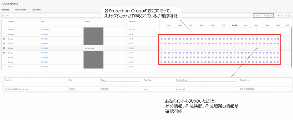 PROTECTIONのうち、Snapshots画面についてご紹介します。Volume、File Systems、Directoriesに対して作成されたSnapshotがローカル(自身の筐体)もしくは、別の機器に転送されているかを確認することができます。このタイムチャートの最大表示期間は30日となり、オレンジ枠で囲んだ部分にて表示期間が選択でき、ここを変更することで、直近1週間や直近3日、などにタイムチャートの表示期間を変更することが可能です。下の画像は、VolumeのSnapshotに関する画像です。画像中でクリックしたSnapshotは、手動で取得したSnapshotとなります。紫の点が一定間隔であるものは、Protection Groupの設定で、定期的にSnapshotを取得するスケジュール設定とすることで、取得されたSnapshotです。