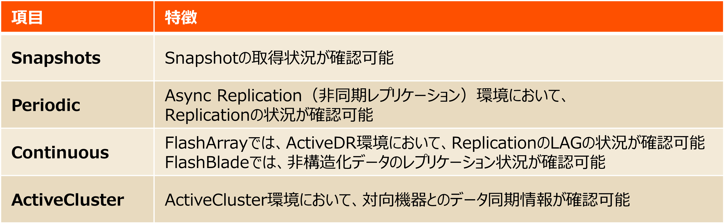 Pure1のPROTECTIONは、ログイン後のPure1画面の左側中部に存在するタブです。Everpure(旧:Pure Storage)社製品のデータ保護に関する管理機能を提供するツールとなり、下記4つの項目で構成されています。各項目の機能を表にしました。
