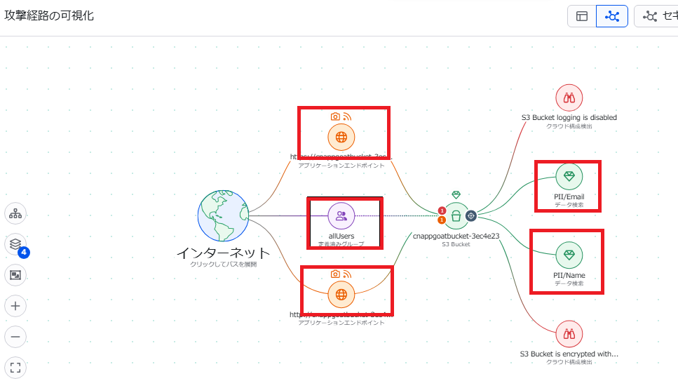 - オレンジのノード:ポート80/443で公開されているS3バケット