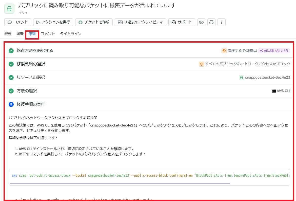 Issueページ上部にある「修復(Remediation)」をクリックすると、以下を選択することで具体的な手順が提示されます: