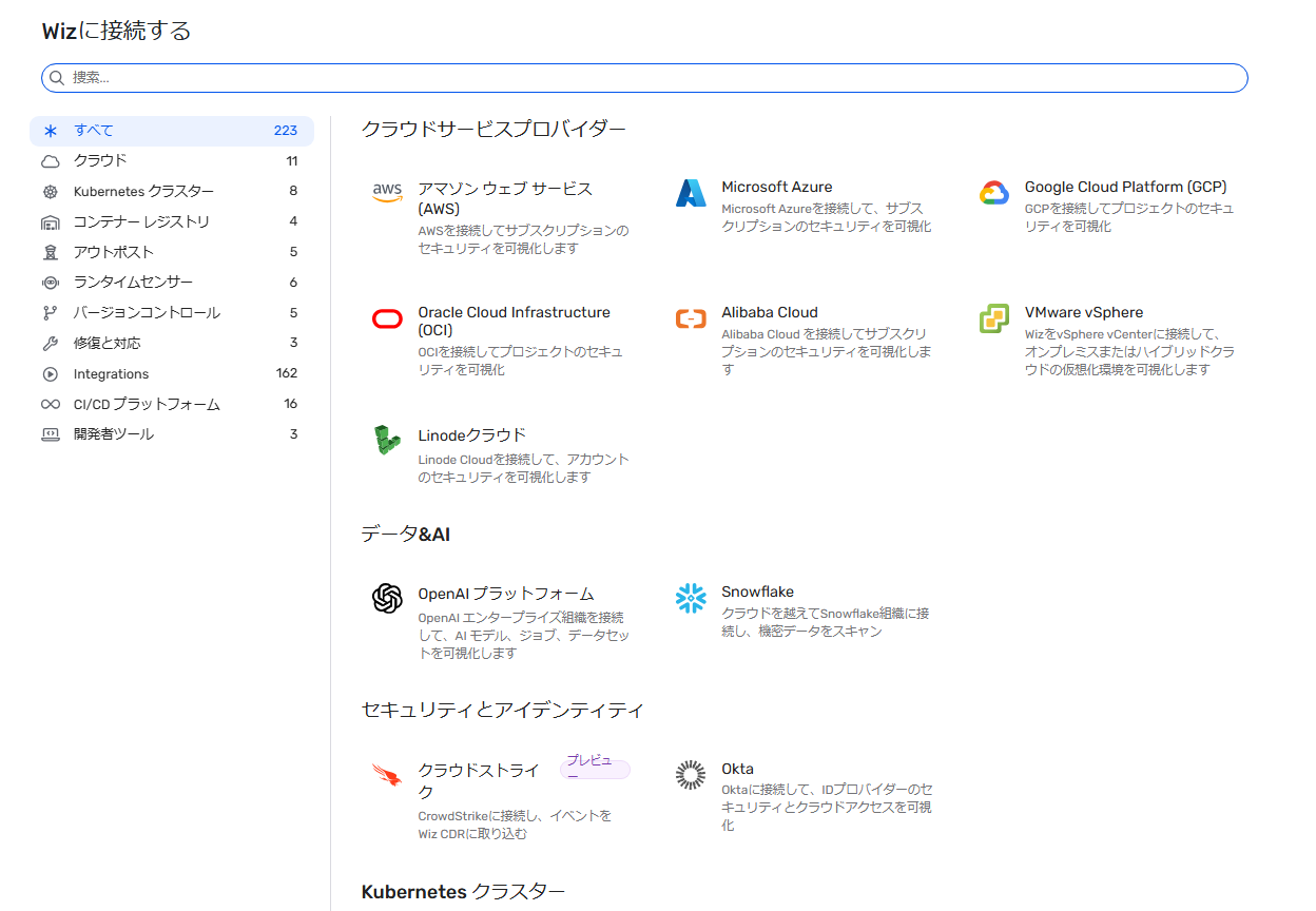 Wizは、AWS / Azure / GCP / Oracle Cloud / Alibaba Cloud / Kubernetes / VMware など、主要なクラウドプラットフォームを幅広くサポートしています。