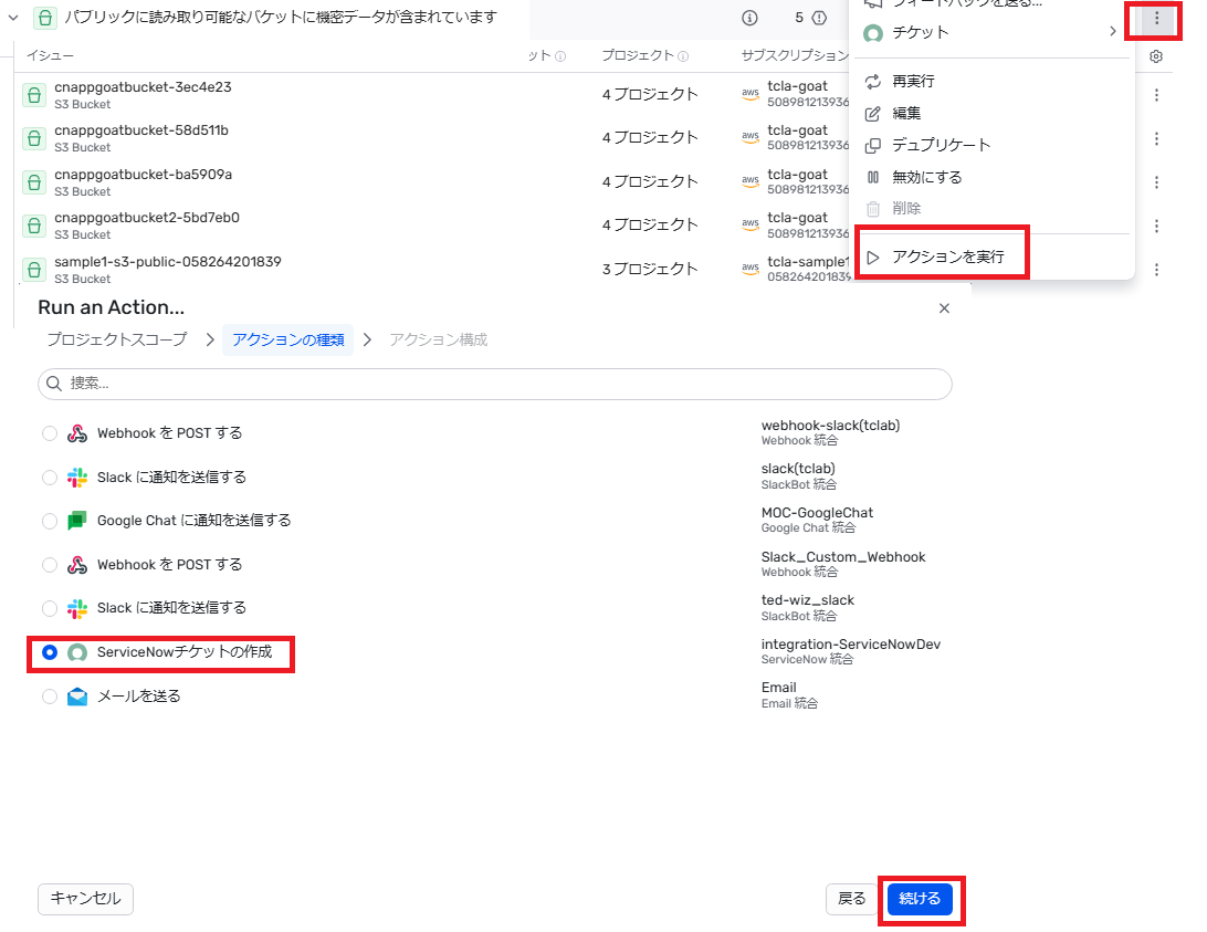 Issue詳細ドロワーから、1件のIssueに対して手動でアクション(例:ServiceNowチケット作成)を実行することが可能です。