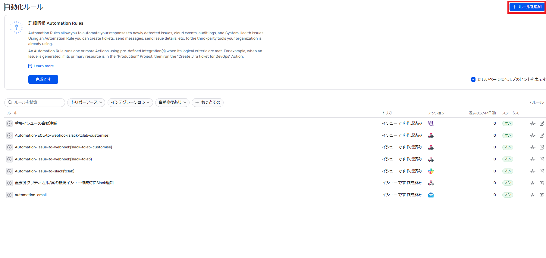 作成した自動化ルールは一覧で確認することができ、またこのページからルールを追加することも可能です。