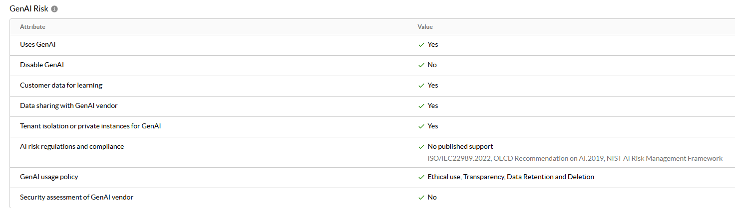また、近年いろいろなサイトやアプリで利用されている生成AIについての情報も確認可能です。以下の画像のような情報が確認可能で、生成AIが利用されているか、オフにできるか、データは生成AIの学習に利用されるのかなどの情報が確認可能です。