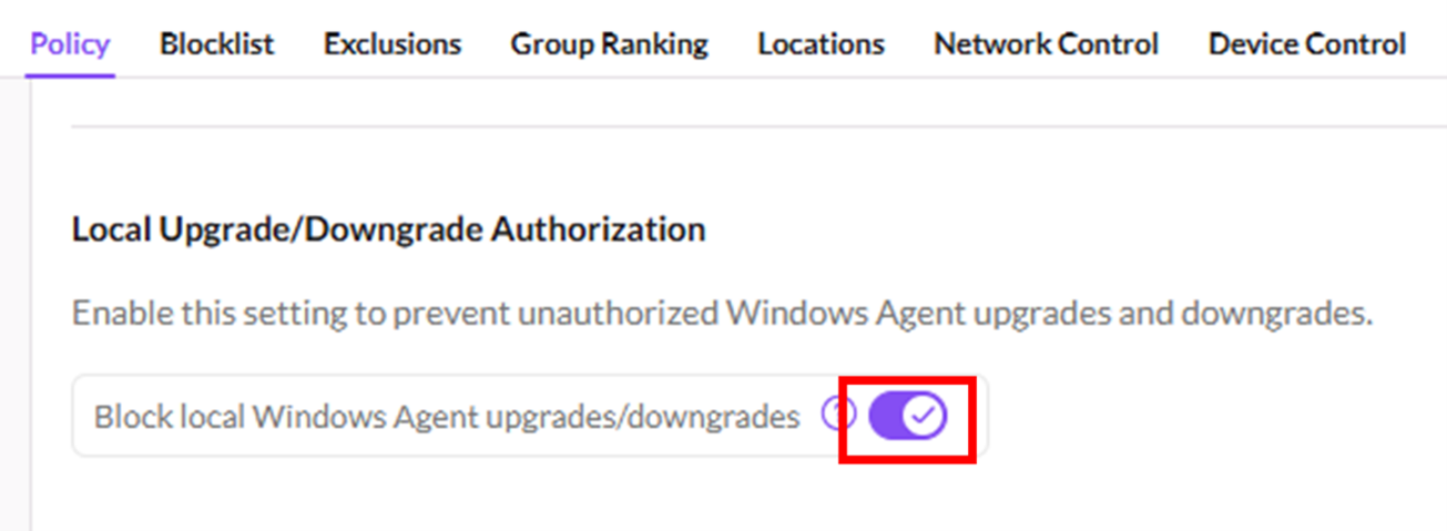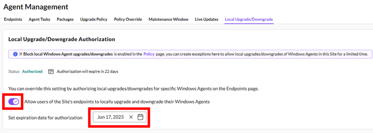 設定対象のSiteスコープに移動 > Agent Management > Local Upgrade/Downgrade Authorization > ”Allow users of the Site’s endpoints to locally upgrade and downgrade their Windows Agents” を有効化 > “Set expiration date for authorization” で認可する期間を設定し > Save Changes