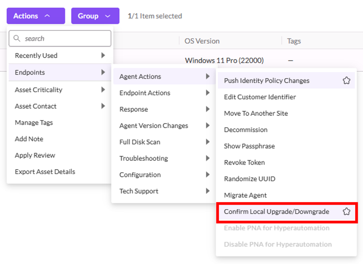 Inventory > Endpoint > 対象端末にチェック > Actions > Endpoints > Agent Actions > Confirm Local Upgrade/Downgrade > “Set expiration date for authorization” で認可する期間を設定し > Save
