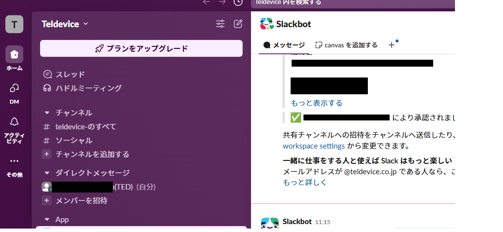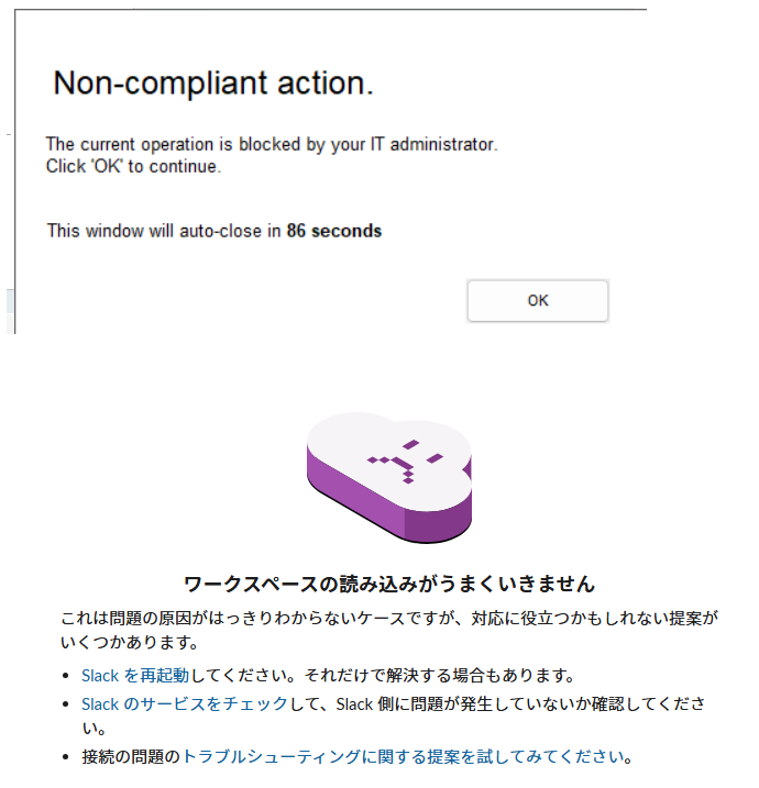 画面右下に「ブロックされた」旨のポップアップが表示され、Slackの画面は読み込まれません。