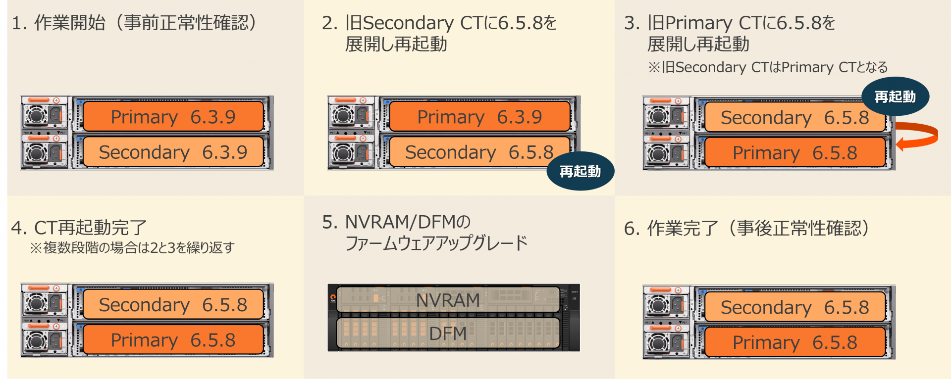 ・ 図の5のファームウェアアップデートでは、ターゲットとなるバージョンに対しての最適化処理として、各コンポーネント(NVRAM/DFM)の新しいファームウェアがある場合に、自動的に1本ずつファームウェアアップデートが行われ、各コンポーネントの再起動が発生します。ターゲットとなるバージョンによっては、ファームウェアアップデートが行われない場合もあります。