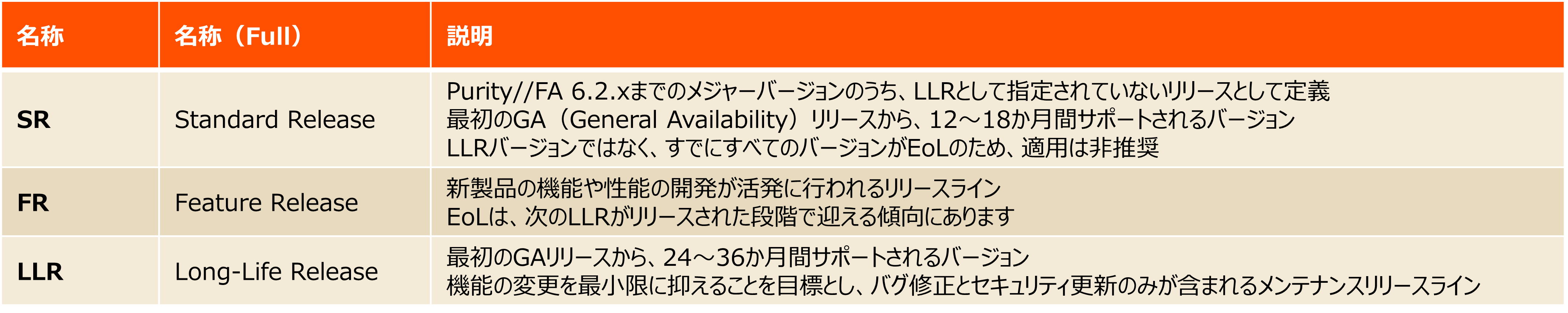 Purityは、3桁の数字で、X.Y.Zで表記されます。そのうち、X.Yをメジャーバージョン、Zをメンテナンスバージョンと表現します。メジャーバージョンのリリースでは、新機能の追加などが盛り込まれ、メンテナンスバージョンのリリースでは不具合修正が中心となります。また、メジャーバージョンではそれぞれ、SR、FR、LLRが定義されます。合わせてサポート期間(EoL:End of Life)となる年月が定義されます。