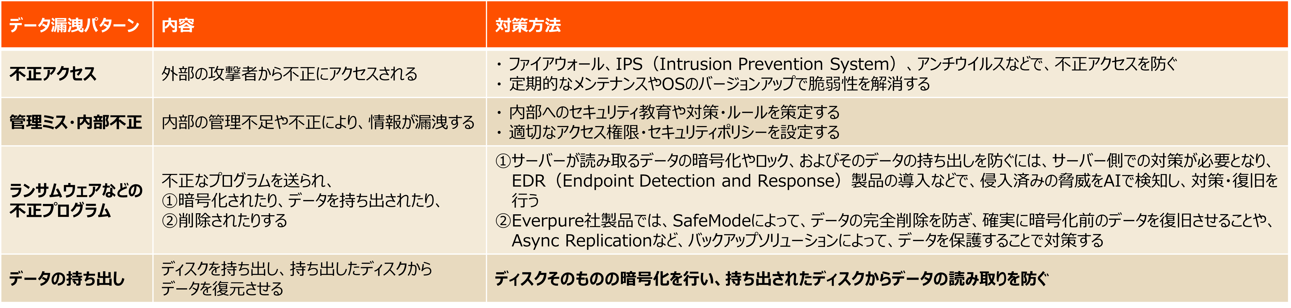 昨今のランサムウェアなどのサイバー犯罪の被害増加により、データ漏洩を防ぐ・データを保護する、ということの重要性が高まっています。下記の表に代表的なデータ漏洩のパターンをまとめました。