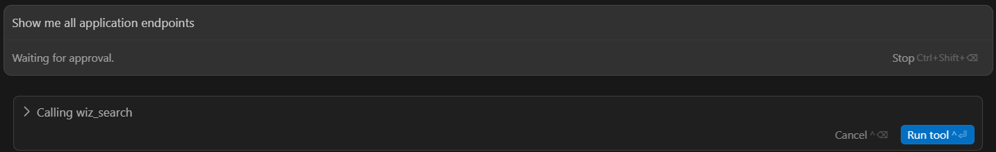プロンプトを受け取ったAIがWiz MCPサーバーにアクセスし、クエリを発行しようとしており、実行する前に確認がはいります。「Run tool」をクリックすると実際にWiz MCPサーバーを通してクエリを実行してくれます。
