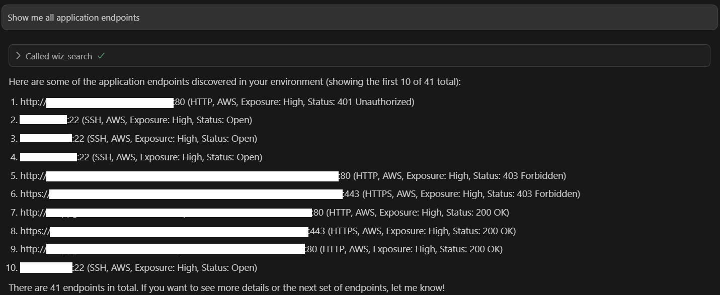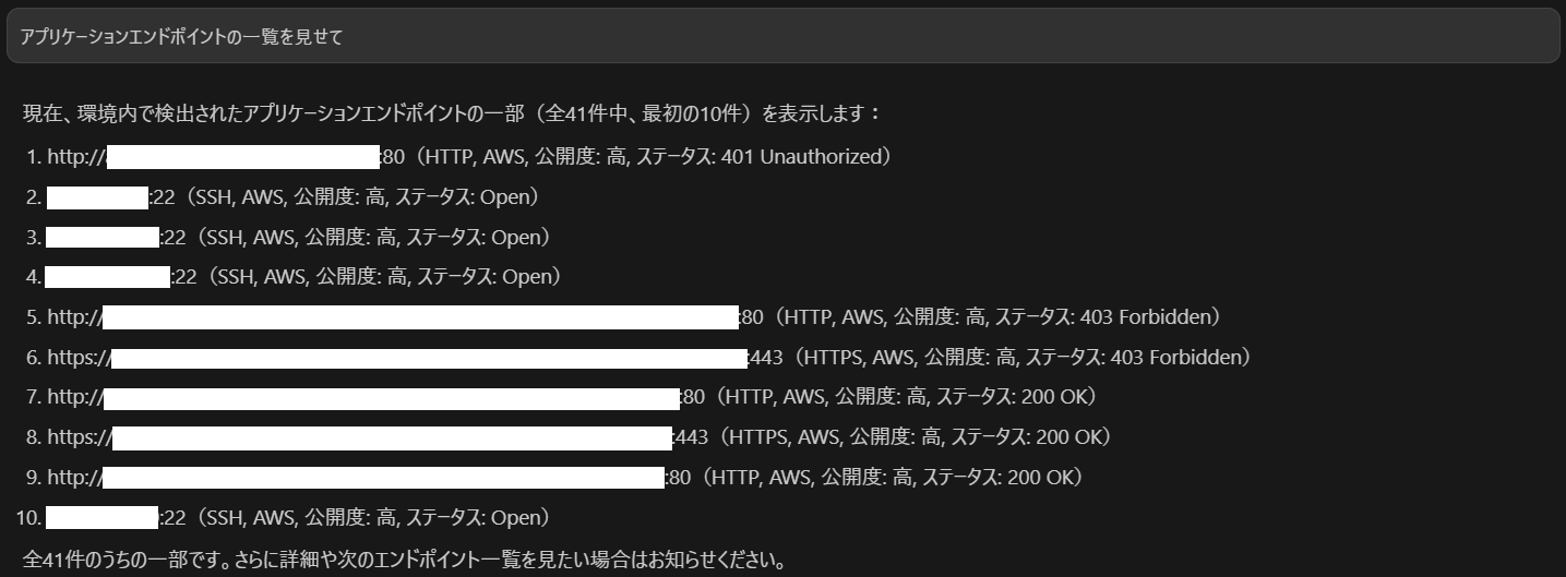 クエリを実行し受け取った結果を元に、AIが内容を整理し回答してくれます。Wiz CNAPPでスキャンしているこのクラウド環境には41のアプリケーションエンドポイントがあり、そのうちの10件が列挙されてきました。