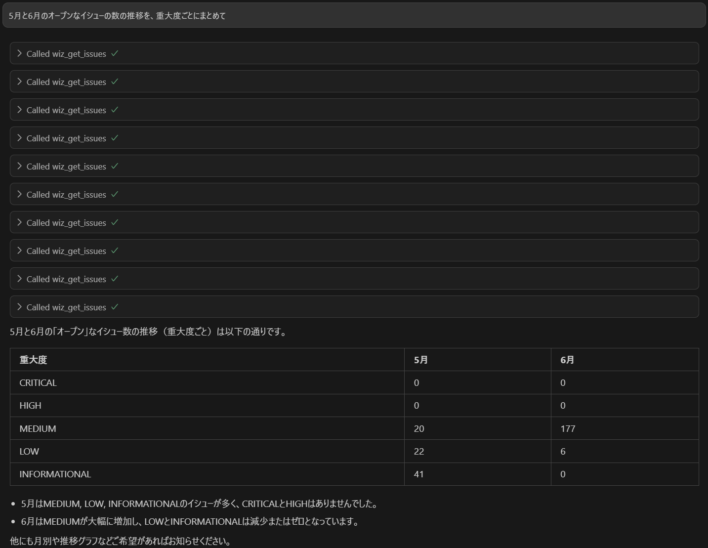 いけました!言語の処理はAIエージェント側がやってくれています。また、同じチャットウインドウの中での処理であるため、先ほどした英語の質問に対する回答をそのまま日本語で出力していますね。「Run tool」ボタンによる事前確認が入らなかったため、Wiz MCPサーバーにアクセスして情報を取得していないことがわかります。
