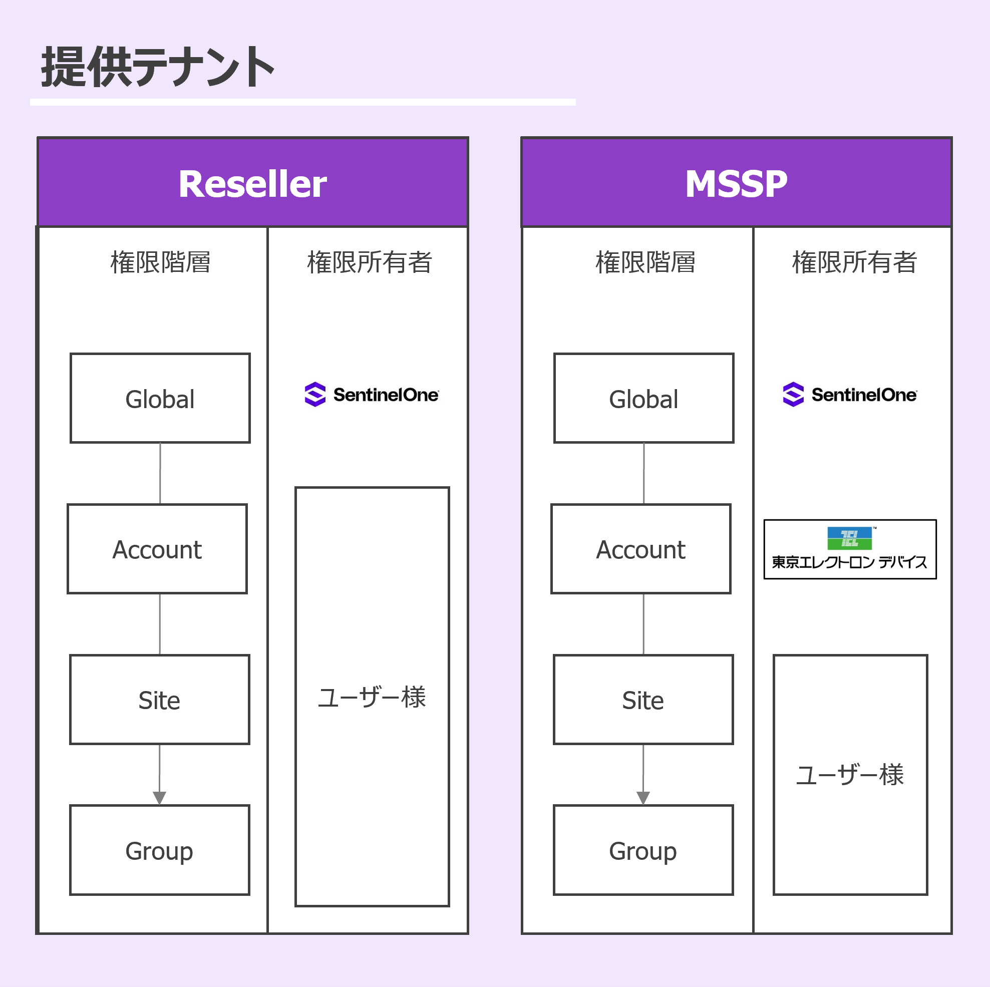 通常のライセンスでは、SentinelOneのAccount階層からテナントが提供されますが、MSSPライセンスではSite階層からのテナント提供となり、より柔軟な運用が可能です。