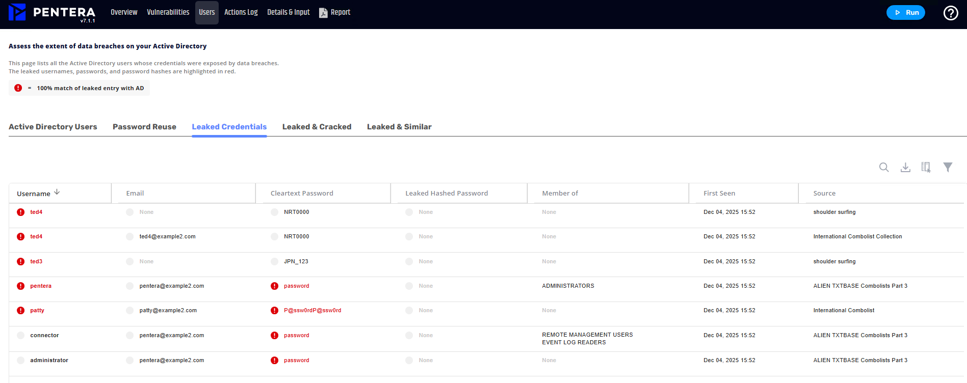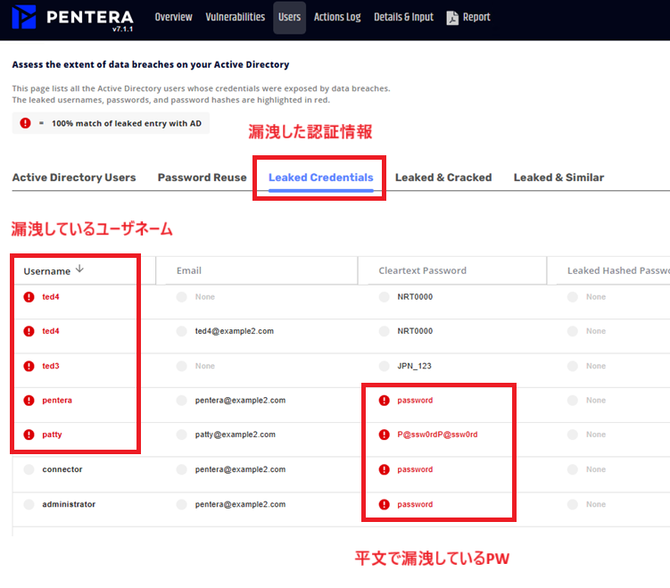 ダークウェブなどの外部で漏洩して公開されている認証情報(メールアドレス、ユーザー名、平文パスワード、パスワードハッシュなど)を、Penteraは収集し、ユーザに提供しており、自社ドメインに紐づくアカウントの評価を実施できる仕組みです。