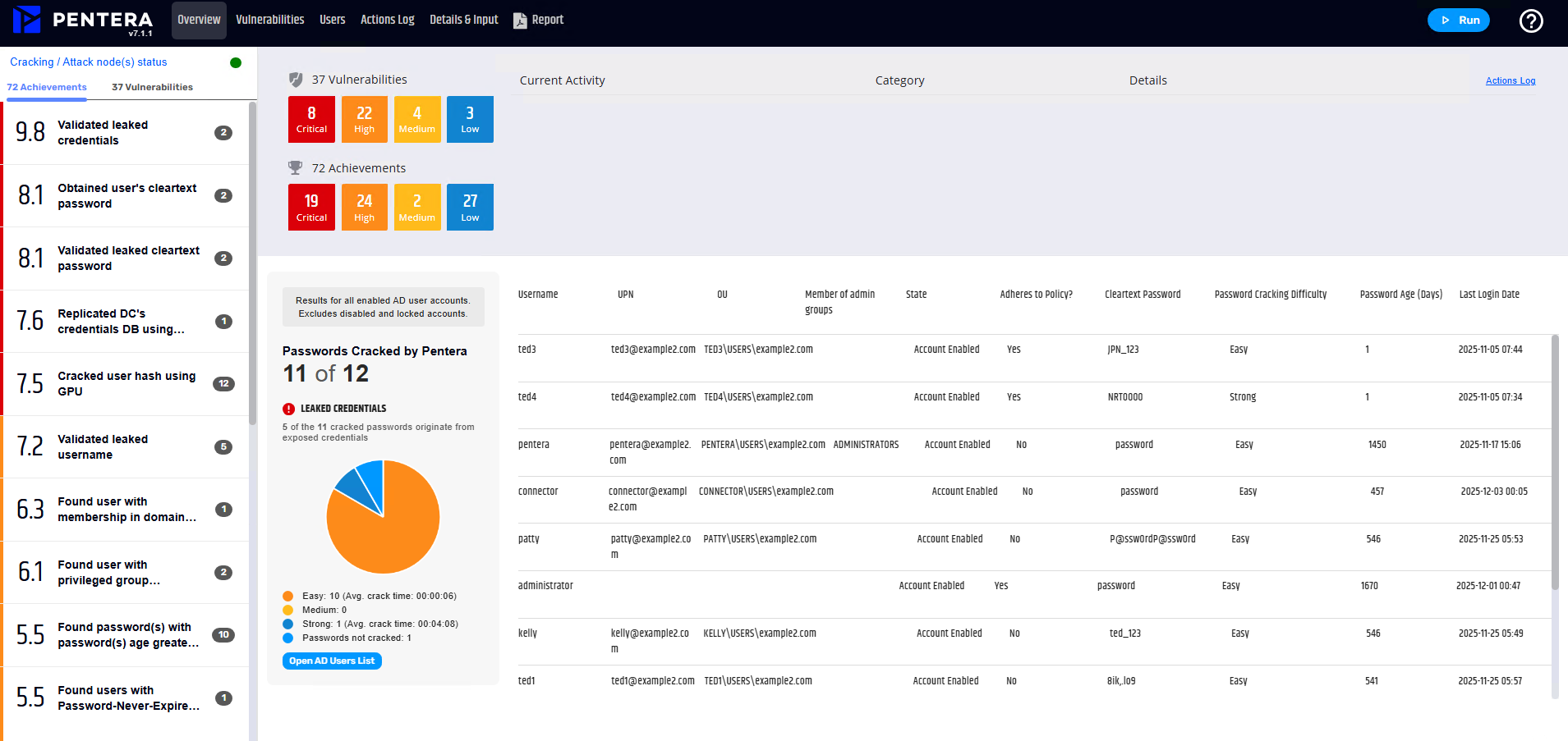 ADに登録されているパスワードのハッシュ(SHA512など)を取得した上でPenteraのGPUを用いてクラッキングし、どれだけの時間でPWを破ることができるかを検証しPWの強度を測ることが可能です。