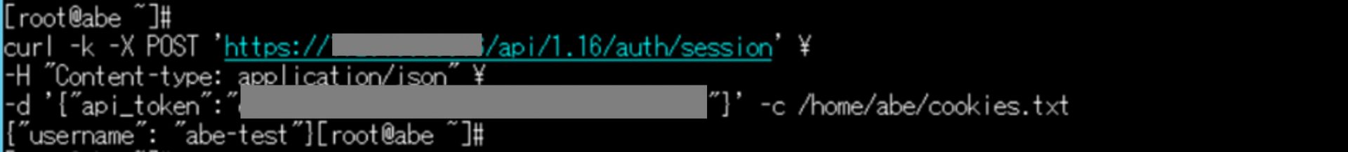 curl -k -i -X POST 'https://<FAのIPアドレス>/api/<APIバージョン>/auth/session' -H "Content-type:application/json" -d '{"api_token":<APIトークン>}' -c /任意のディレクトリ/任意のファイル